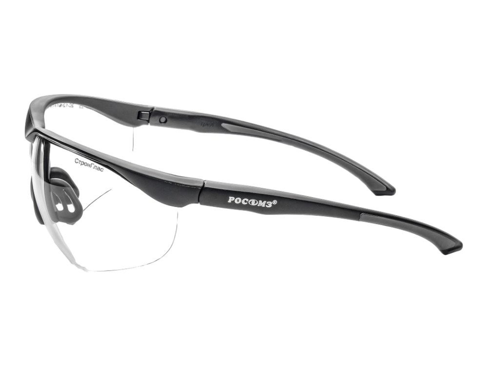 - Открытые с мягкой вставкой из ТЭП в области лба, двухкомпонентными регулируемыми по углу наклона заушниками с мягкими вставками из ТЭП защищают от высокоскоростных летящих частиц с низкоэнергетическим ударом 0,84 Дж.